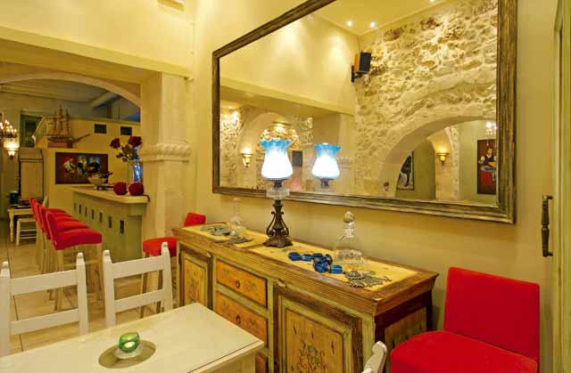 Raki Baraki is our new possession and little jewel. It is our very own, personal version of the classic Cretan Raki place. With tables that, in the summer, lie in a cool backstreet of the town, under vines and bougainvilleas, it invites you to experience unique moments of our pleasure and relaxation. Immerse yourselves in the traditional low sofas with the thick cushions and enjoy your cup of coffee or ice cream in the mornings. Taste traditional spirits and rare Cretan delicacies, as well as delicious dishes by our cookγs very hands, in an environment full of the images, the music and the fragrances of Cretan tradition. The classic Cretan Raki place through our own eyes.