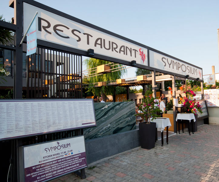 SYMPOSIUM - RESTAURANT The ideal SYMPOSIUM in Ancient Greece was almost like a ritualistic Its aim was to savor the aesthetic pleasure of the wine, to be intoxicated, just enough to relax and release the mind from inhibition and to stimulate conversation. It was a social institution where great philosophers and great thinkers were having deep and meaningful conversations stimulating the mind. The SYMPOSIUM belonged excessively to the privilege elite and it was characterized by its philosophical and political conversation and creative competition, in which elegies were sung to the accompaniment of a FLUTE and LYRIC songs by the LYRE. The SYMPOSIUM usually took place in the 'ANDRON' the men's room, the most well appointed room in the house. Our Symposium opened its doors some centuries later, actually in 1998,aiming and succeeding in providing an exclusive cuisine, the best service and a most relaxing atmosphere for our clientele. Its activities were dictated by a symposiarch, who decided up on the entertainment for the occasion and even how much water would be mixed with the wine. The Symposium might end with the comus (COSMOS), a boisterous procession of revellers, accompanied by music and singing in hon our of the GODS, to yet another drinking PARTY.